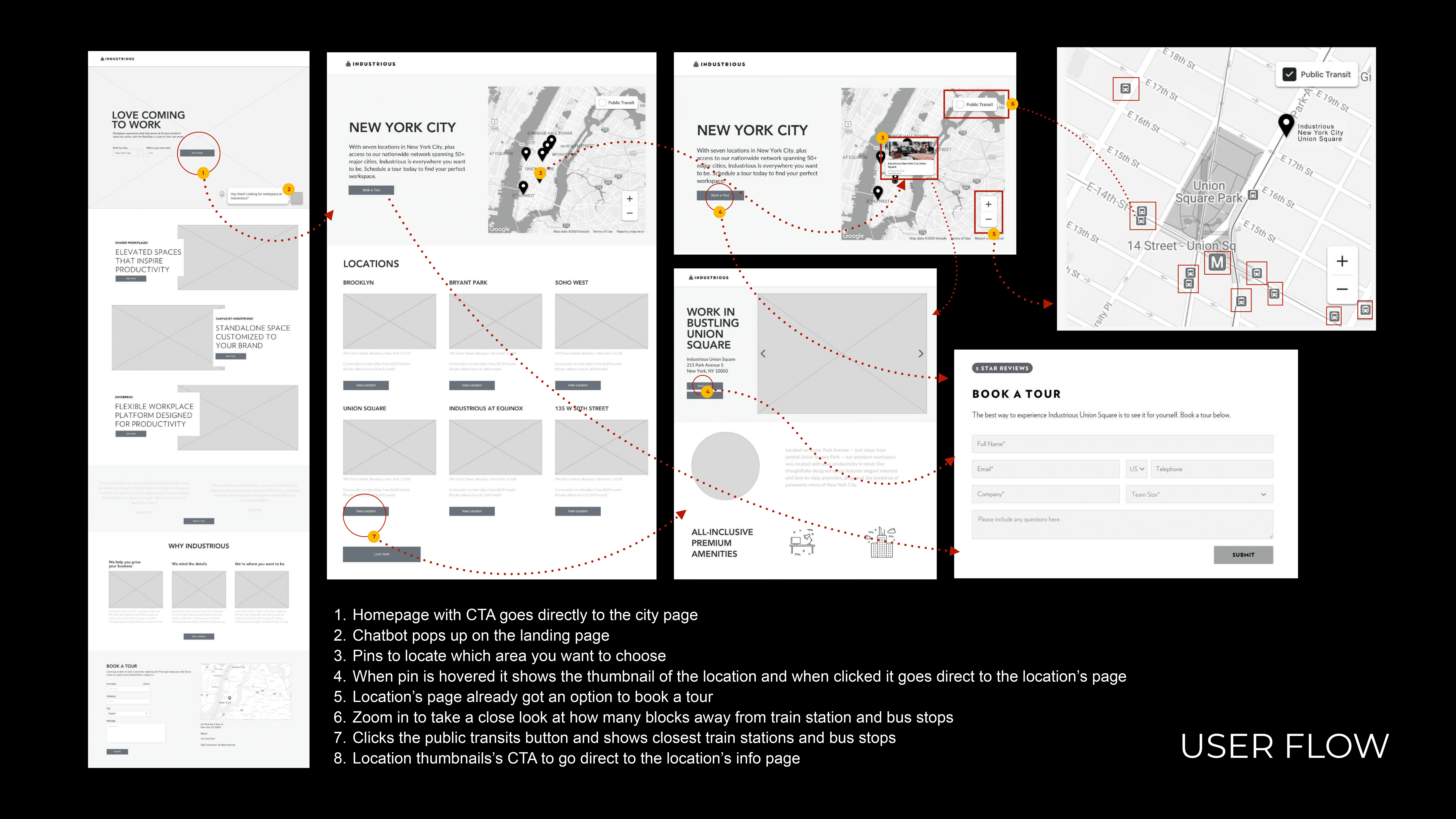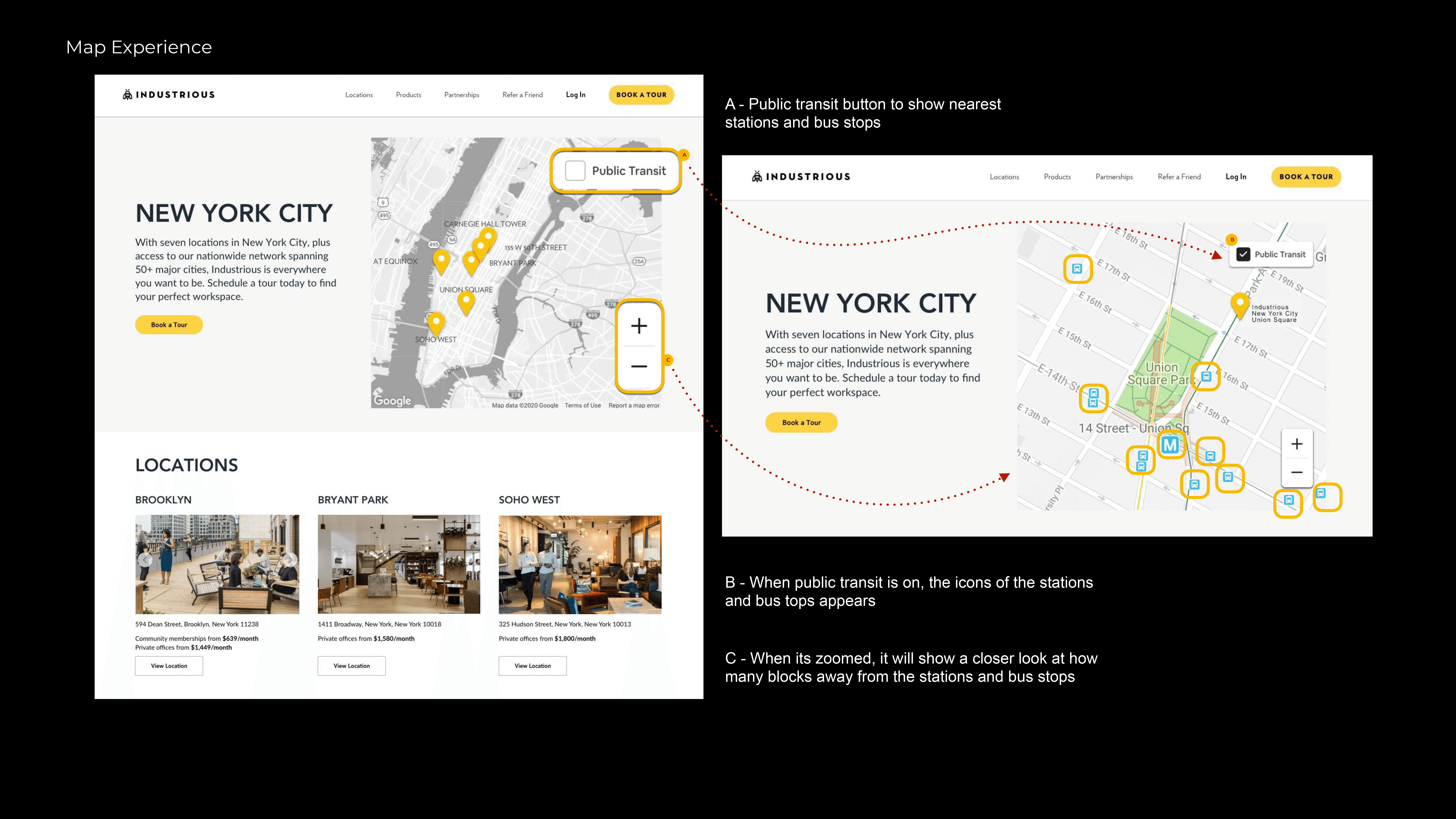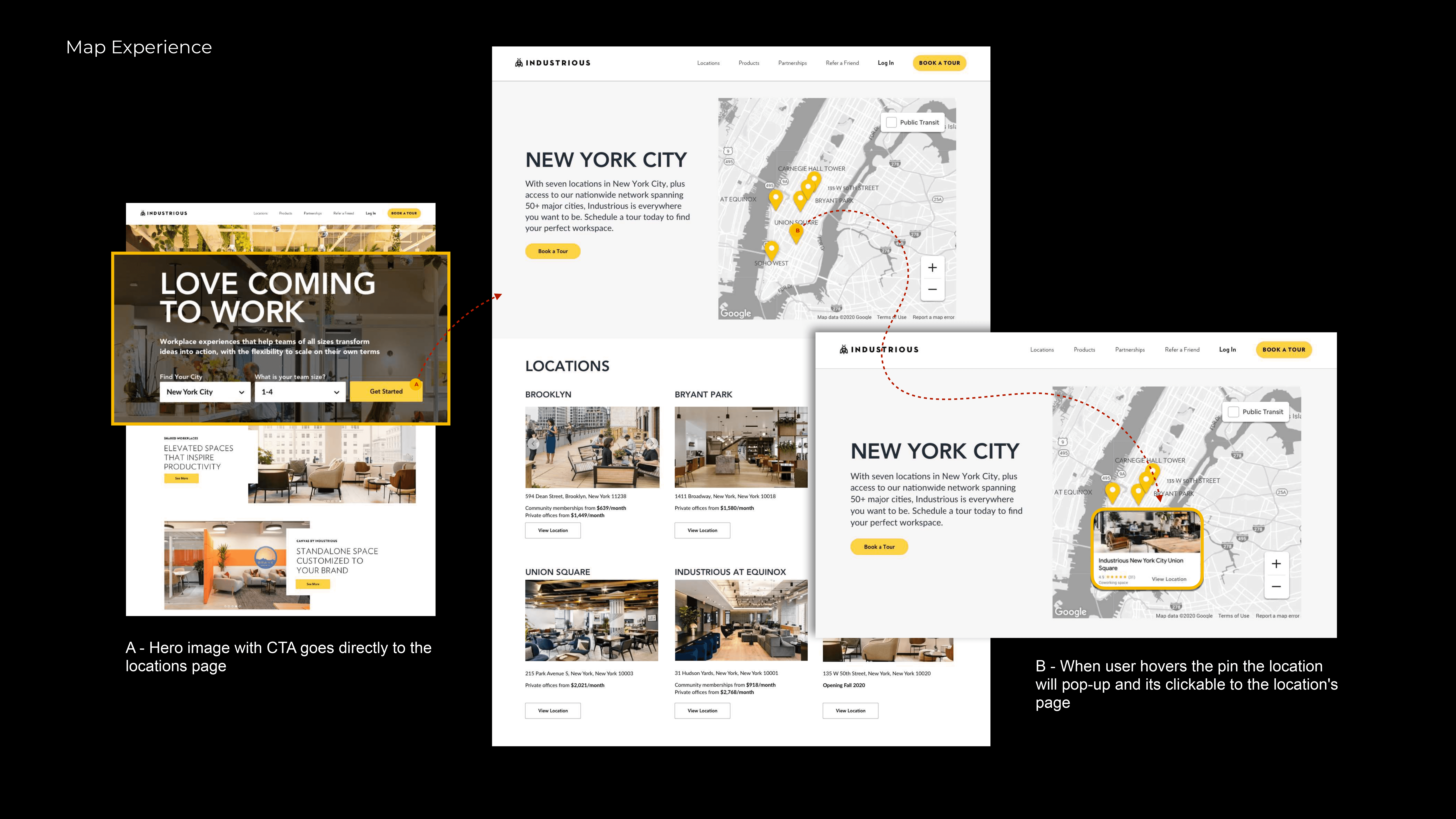 Design solution for the Industrious homepage. They would like their users to arrive on their homepage and be able to find a space that is suitable for them, large enough for their company, and offers enough value to entice them to book a tour.