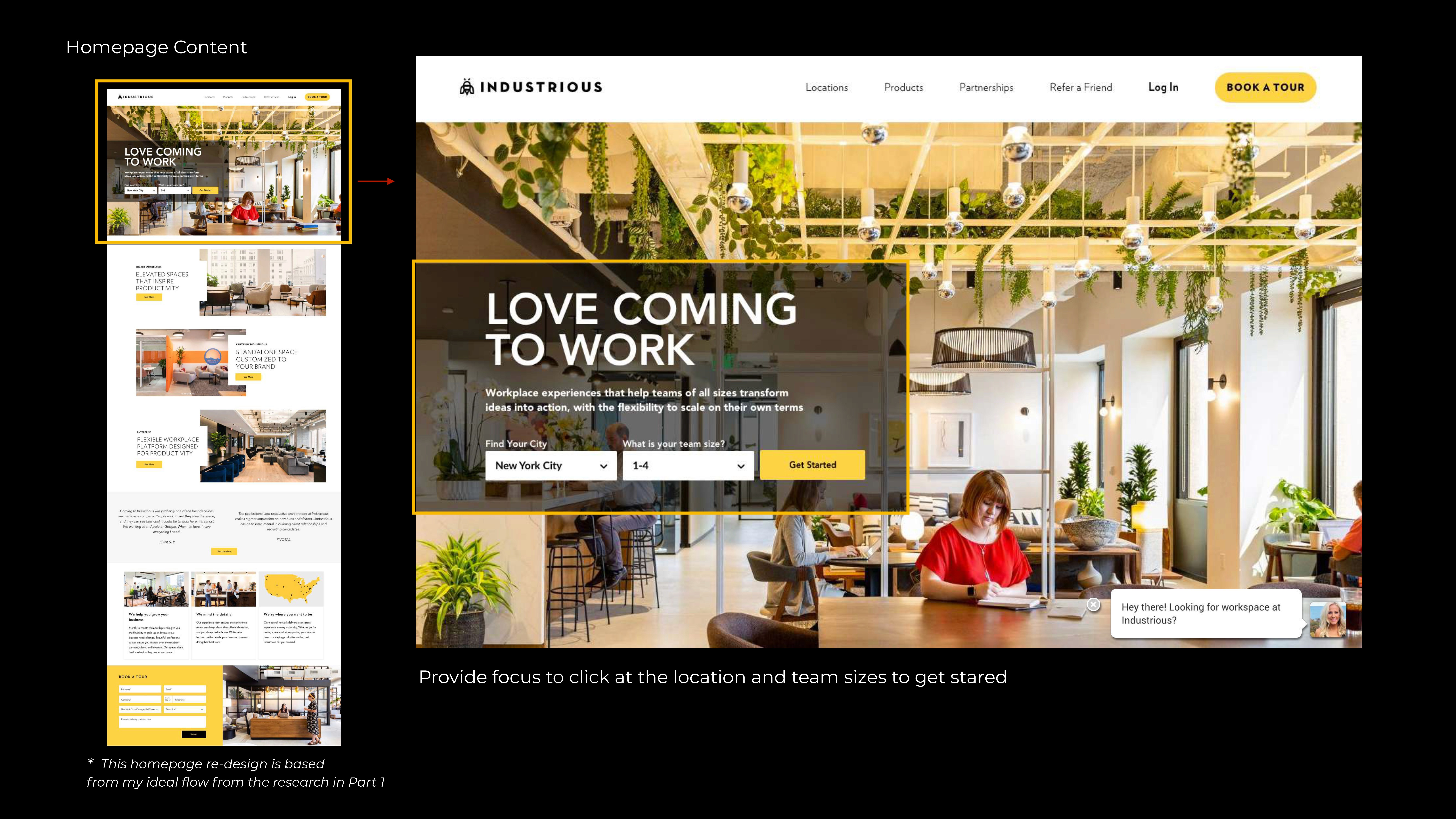 Design solution for the Industrious homepage. They would like their users to arrive on their homepage and be able to find a space that is suitable for them, large enough for their company, and offers enough value to entice them to book a tour.