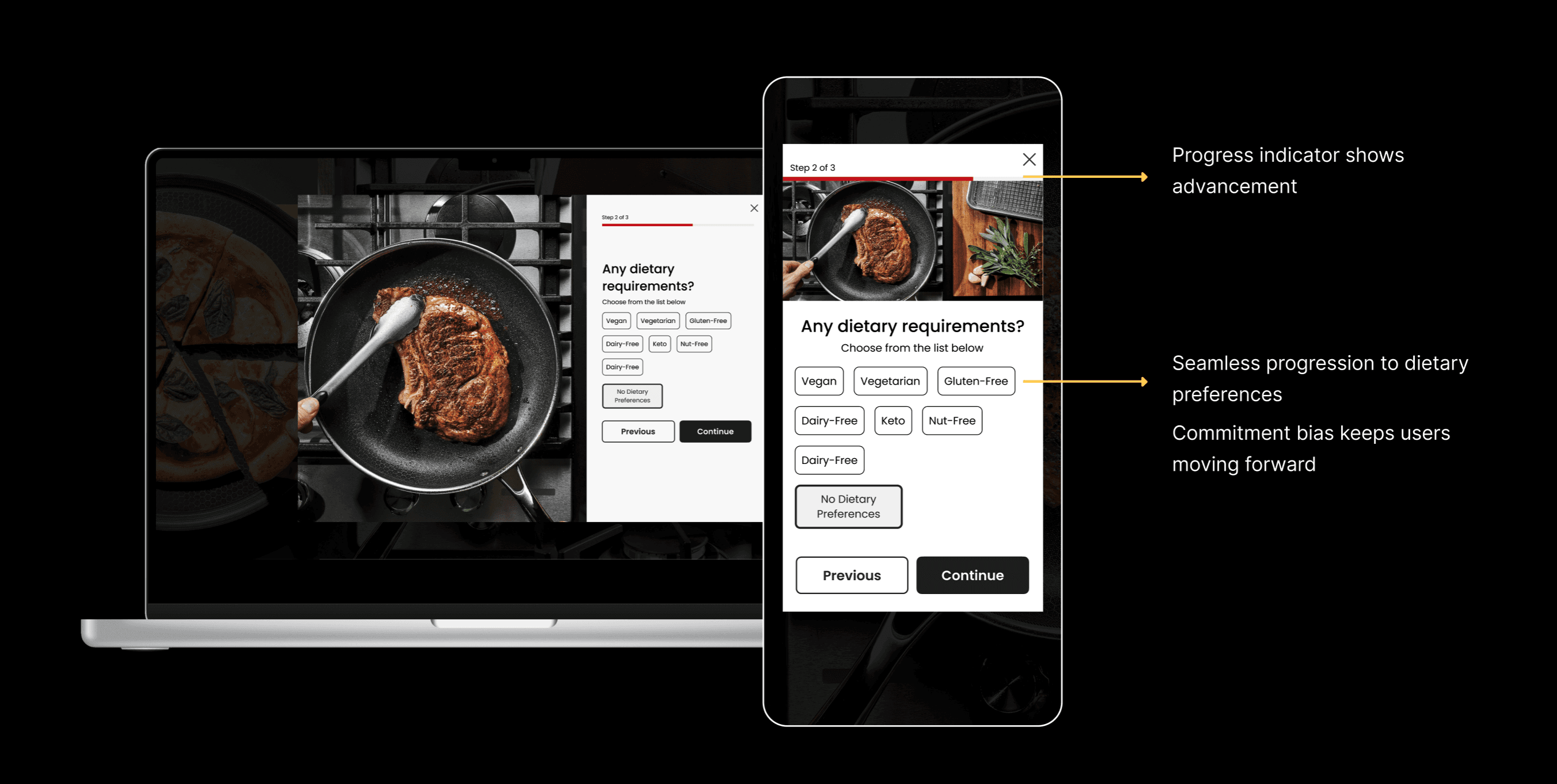 Cons: Marketing team required dietary data for personalization; partner opt-ins were contractual obligations; fewer data points reduced email segmentation capabilities | Cons: Adds complexity to the critical first impression; could overwhelm users before they commit | Cons: Risk of modal abandonment; requires careful progress indication; more complex implementation |