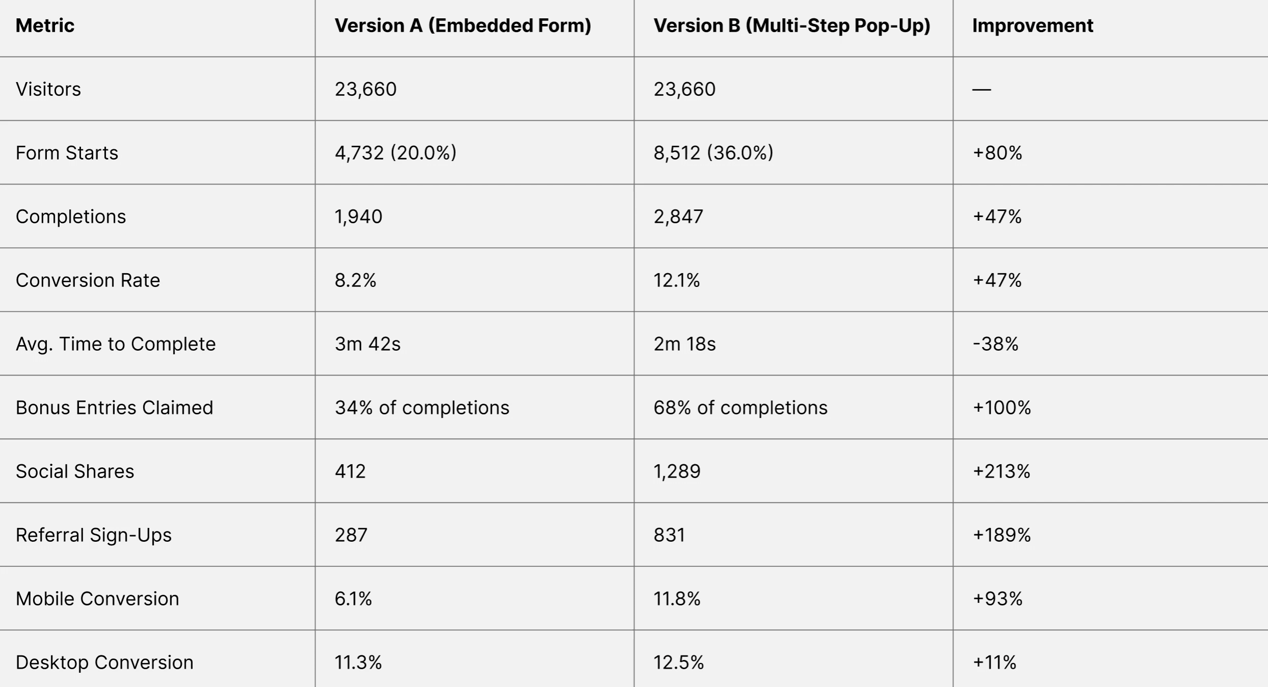 The multi-step pop-up modal significantly outperformed the embedded landing page form, delivering a 47% increase in conversion rate and 907 additional newsletter subscribers. By reducing cognitive load, maintaining user focus, and seamlessly integrating bonus entry opportunities, Version B created a superior user experience that drove both immediate conversions and viral growth.